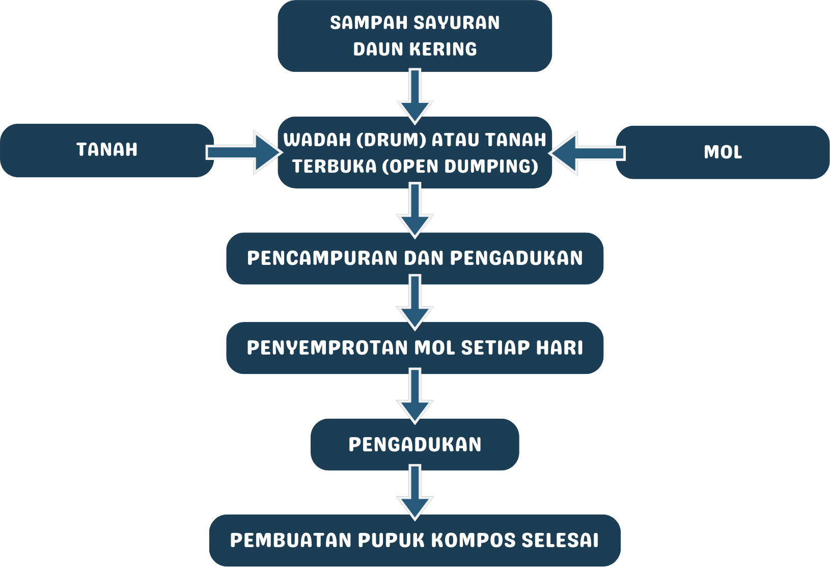 Setelah Mikroorganisme Lokal berhasil dibuat, maka Pembuatan Pupuk Kompos dapat dimulai dengan bahan-bahan yang dibutuhkan seperti tanah, Wadah (Drum) atau Lahan tanah terbuka (Open Dumping), dan MOL itu sendiri. Alur dari pembuatan Pupuk Kompos dapat dilihat pada gambar dibawah ini.