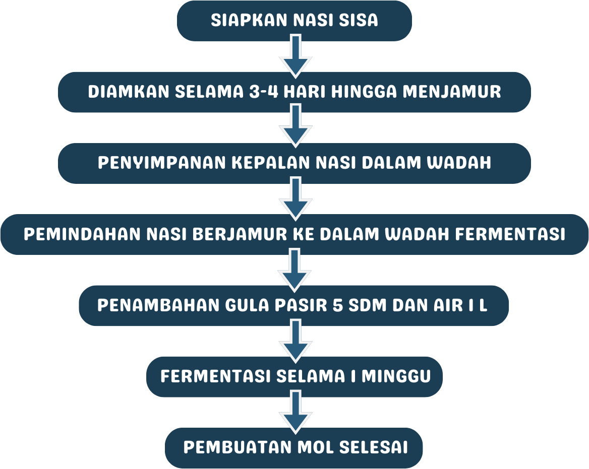 Pembuatan Pupuk Kompos membutuhkan suatu Mikroorganisme Lokal (MOL) yang merupakan larutan hasil fermentasi yang dibuat dari berbagai jenis sumber daya organik dari lingkungan sekitar. Pada contoh kali ini, pembuatan Mikroorganisme Lokal akan memanfaatkan nasi sisa. Selain menggunakan nasi sisa, pembuatan Mikroorganisme Lokal juga dapat memanfaatkan limbah buah seperti tomat, nanas, pepaya, dll. Alur pembuatan Mikroorganisme Lokal (MOL) dengan menggunakan nasi sisa ataupun limbah buah dapat dilihat pada dua gambar dibawah ini.