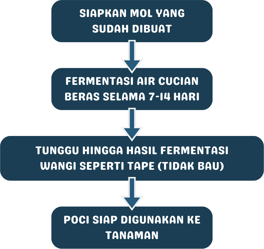 Setelah Mikroorganisme Lokal berhasil dibuat, maka Pembuatan Pupuk Organik Cair (POCI) dapat dimulai dengan menyiapkan bahan-bahan yang dibutuhkan seperti Air Cucian Beras dan MOL itu sendiri. Alur dari pembuatan Pupuk Organik Cair (POCI) dapat dilihat pada gambar dibawah ini.